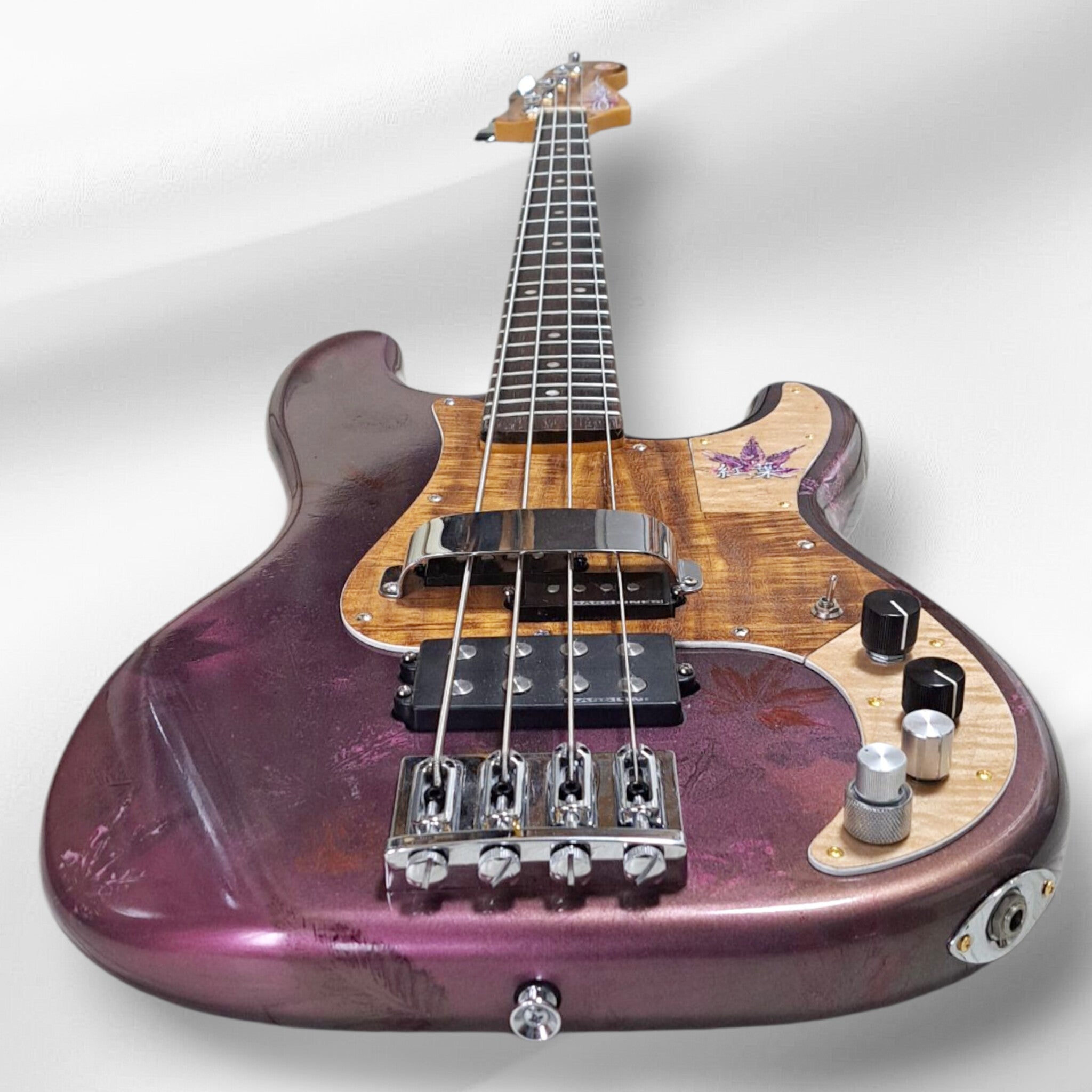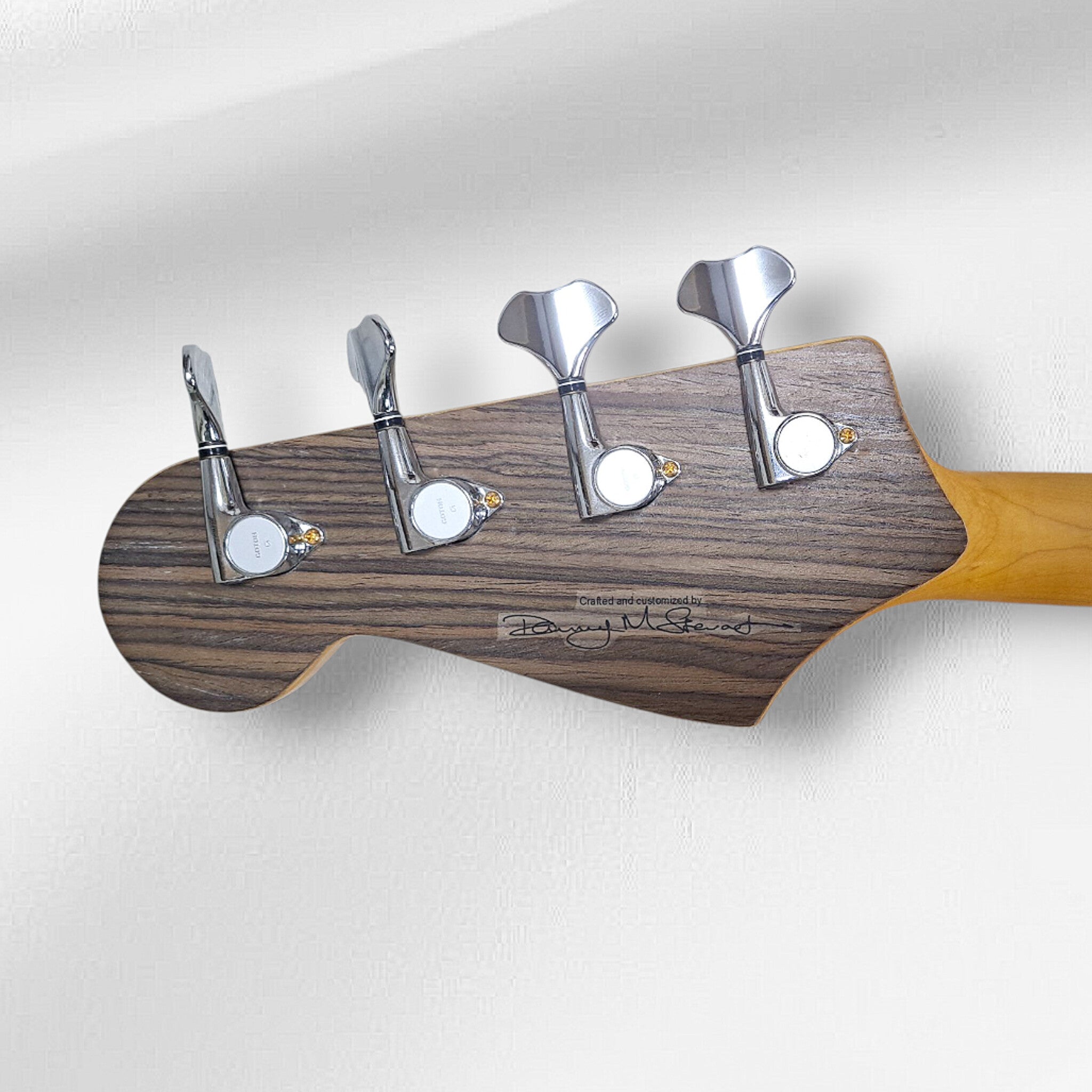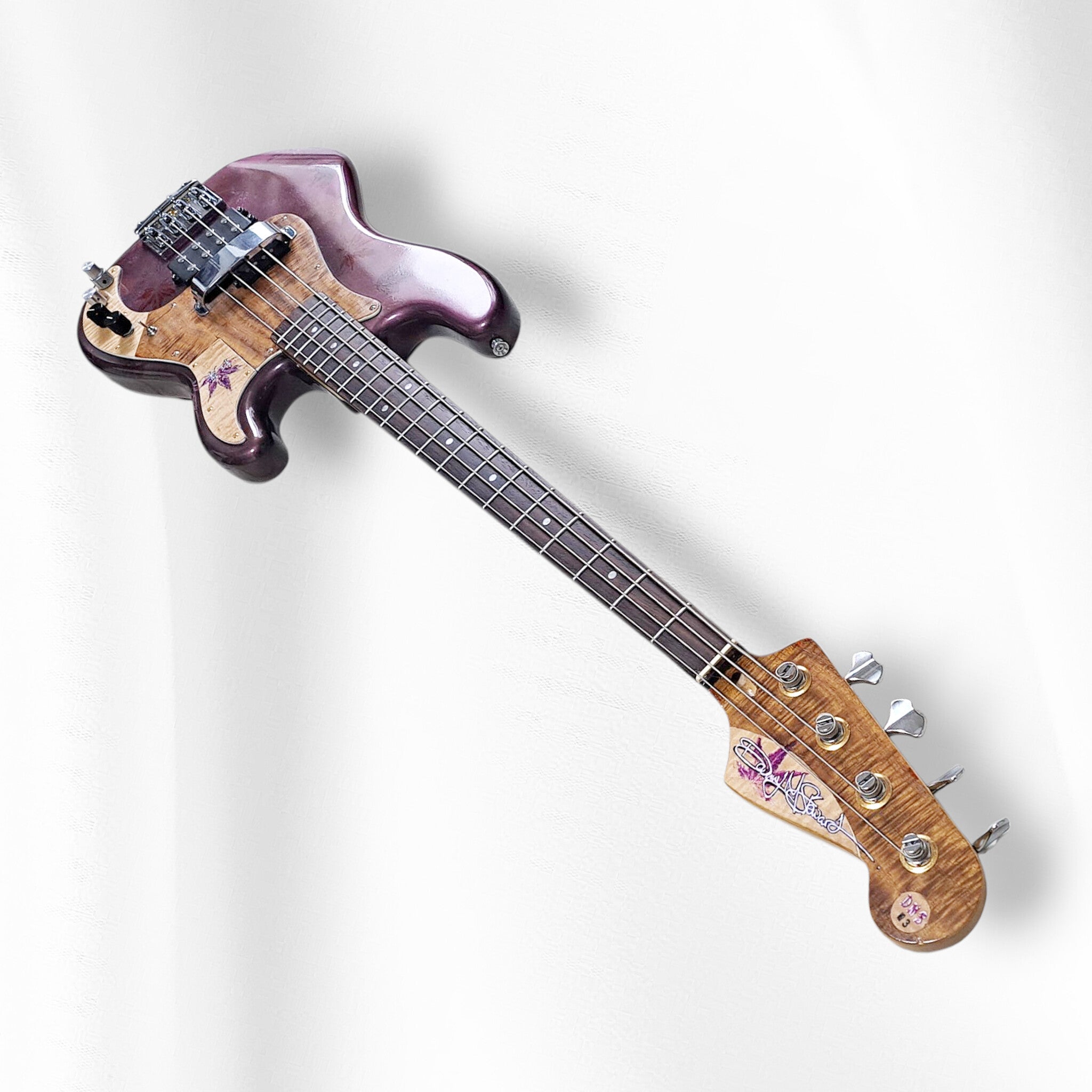 This one comprises a Fender Japan body with an Aria neck, high quality hardware, Seymour Duncan Bass-lines series pickups and a repurposed veneered pickguard.